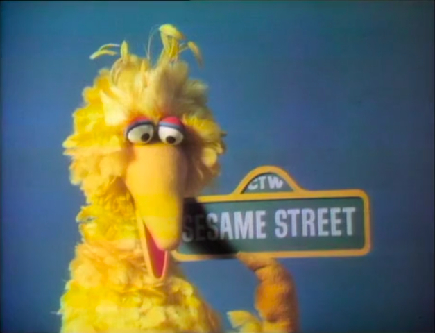 SCENE 9 | Big Bird holds the Sesame Street sign, and Bob and Gordon hold the Children's Television Workshop sign. |