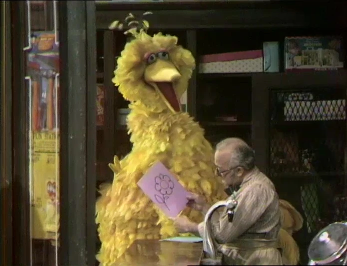 SCENE 4 | Big Bird strolls into Hooper's Store and proudly tells Mr. Hooper that he's remedied his usual, forgetful habits by making a shopping list. He produces large cards with drawings on them, which mnemonically tell him what he wants to buy (such as a picture of a flower, which grows from a seed, which means he wants birdseed). His final drawing is that of a bottle of milk. Mr. Hooper describes a long-winded way this would remind Big Bird to buy something like a loaf of bread, but Big Bird states the picture is merely to remind him to get milk. |
