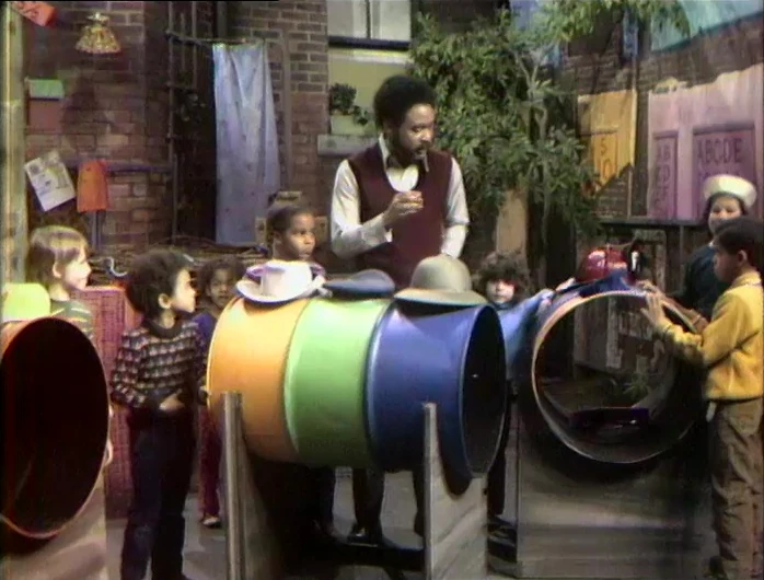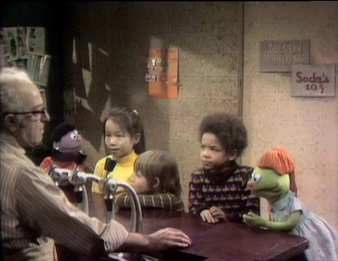 SCENE 6 | At Hooper's Store, some kids (Muppet and human) are at the stools waiting to be served. Tina (Fran Brill) is on one end and insists she is first, provided everyone faces in her direction. On the other end is Rocco (Caroll Spinney), who believes he will be first if everyone faces his way. Mr. Hooper resolves the conflict by serving Christopher, the child in the middle, first instead. |
