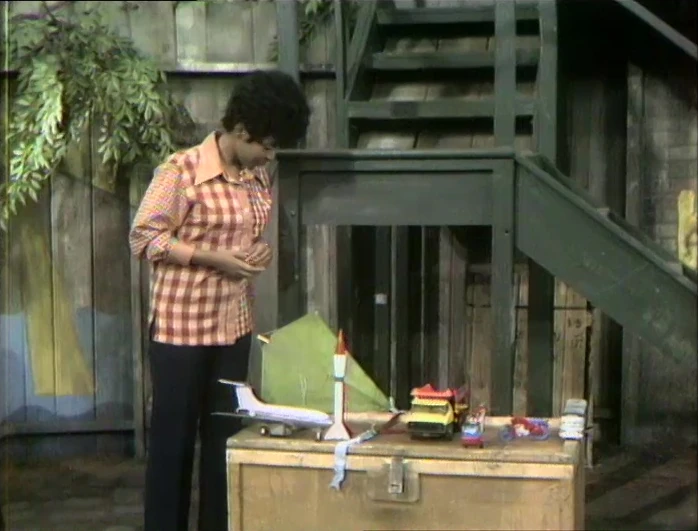 SCENE 5 | Susan points to the various toys left out by the kids. Before putting them away, she uses them for a game of "Here Are Some Things," finding which toy goes with the others that fly. |