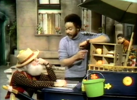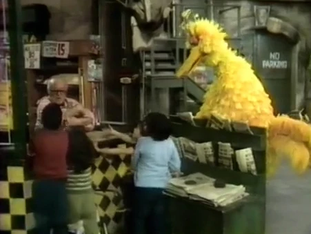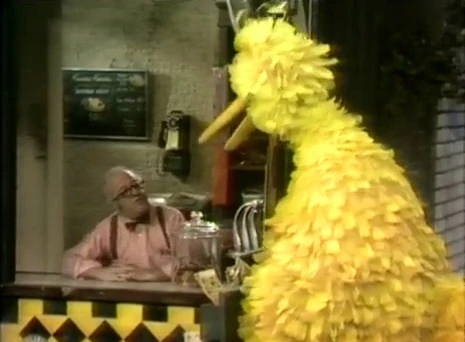 SCENE 8 | Big Bird asks Mr. Hooper for a cookie, even though he doesnβt have any money. Mr. Hooper explains that he just can't give him a cookie for free; otherwise he'd have to do it for everybody. Big Bird really wants to test this hypothesis, so Mr. Hooper gives him the cookie to prove it. Big Bird starts to show off his free cookie, and suddenly Gordon and the kids bombard Hooper's Store for one! |
