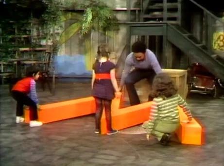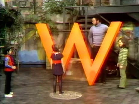 SCENE 1 | Gordon welcomes the viewer and sees the kids sitting on a giant letter, which he says is an M; the kids claim it's a W. When Gordon tries picking it up to portray it as an M, he has trouble. The kids pick it up with ease and display it as the intended letter - W. |
