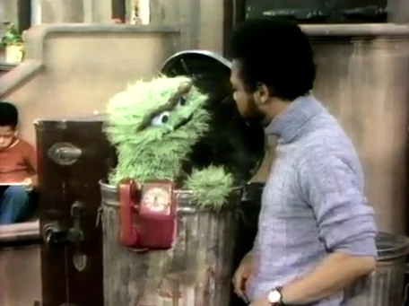 SCENE 2 | Oscar shows Gordon the new grouch phone hanging on his trash can. His old phone bothered him as people continued to call him again and again, but he guarantees that with the new one, people will only end up calling him once. Right on cue someone calls Oscar, and the phone makes a cacophony of animal sounds, train whistles, clanging, and a Tarzan yell instead of rings. Oscar happily retreats into his can singing, "One less bell to answer..." |