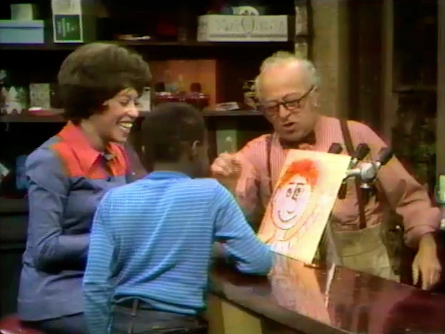 SCENE 5 | Mr. Hooper has given Louise and Ronald a piece of paper to draw on. Mr. Hooper looks for another paper with a number written on it that was to remind him how many tomatoes Bob ordered, but he can't find it. Louise and Ronald realize it's the same paper they're drawing on, so they look for a number embedded in the picture. They find a number 5 as part of a boy's face, so Ronald helps count out five tomatoes for Bob. |