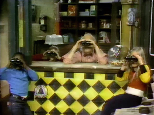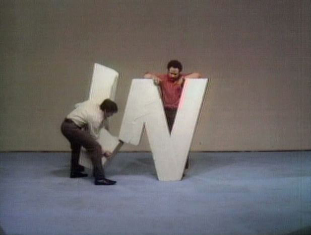 CLOSING SIGNS | Mr. Hooper holds the Sesame Street sign, and Bob and Gordon hold the Children's Television Workshop sign. |
