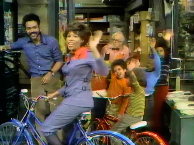 SCENE 4 | Bob observes that a lot of children are on Sesame Street, and rides his bicycle down the street to count how many there are. He counts Brynne, Tymee, Lance, Cassandra, Ronald, and Chris. He stops at Willy's hot dog cart where Kim gives him a big hug, making seven kids in total. |