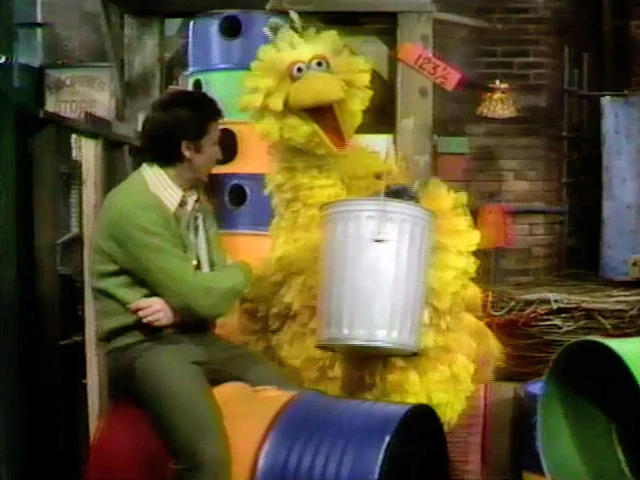 SCENE 6 | Big Bird hears on the radio that it's National Clean Up Your Nest Week. He puts all his trash in a trash can, then wonders where to put it so the trash collector can get it. Bob suggests he put it where everyone can see it. Big Bird puts it on top of a round barrel, and it falls and spills. |