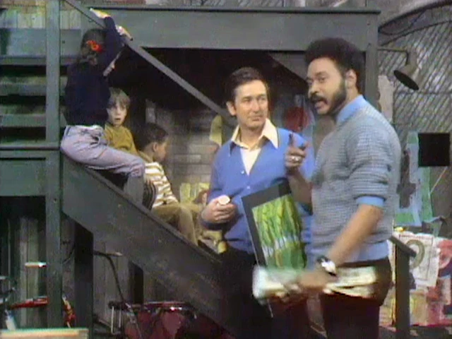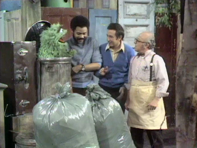 SCENE 2 | Gordon and Susan have gathered Maria (Carla Pinza), Mr. Hooper, Bob, and Big Bird to discuss the garbage removal situation. Susan and Maria are going to walk up and down the block asking everyone to put their garbage out in the hallway of their buildings. Bob and Gordon are going to use some plastic bags provided by Mr. Hooper to gather the trash and bring it out to the street, while Big Bird is going to use his wagon to collect the bags. Most everyone breaks to do their part when Bob asks Gordon about what they're going to do with it next. Gordon reveals that Oscar the Grouch will play a key role, despite his penchant for not cooperating. |