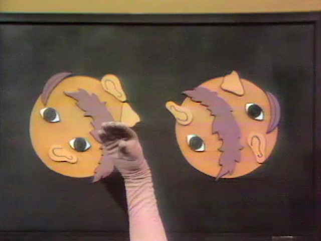 Muppets | The Hands Part 1: Kids provide voiceover commentary as a green hand builds a face out of pieces. A purple hand tries to do the same, but gets all the parts mixed up. The green hand helps the purple hand make the face look like the one on the left. (First: Episode 0212) |