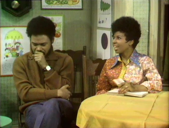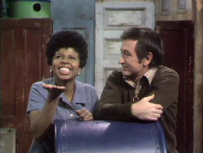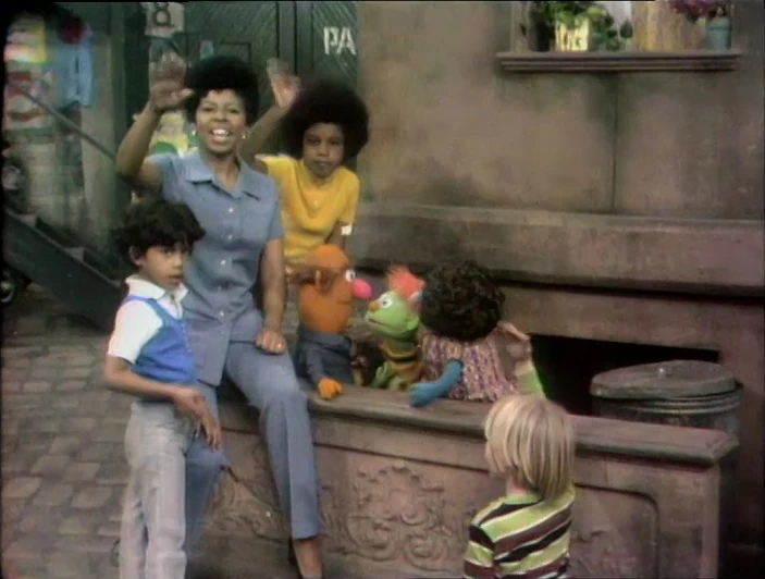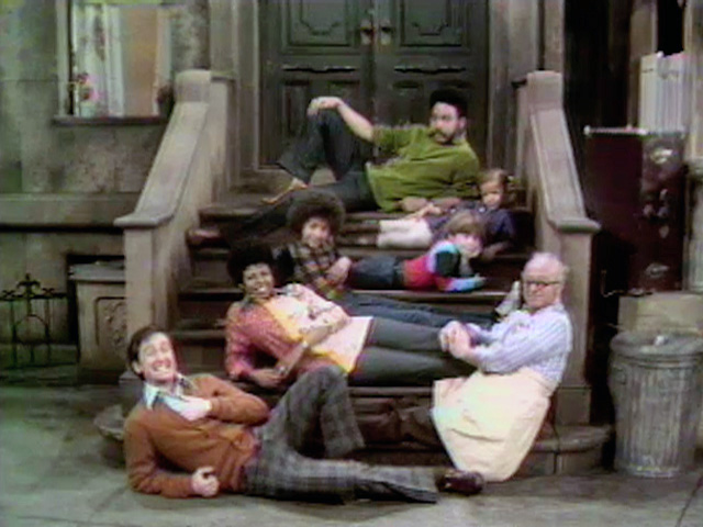 Insert | Mr. Hooper, Susan, Gordon, Bob, and three kids are counted (in voiceover by Fran Brill) as they rearrange on the stoop. |
