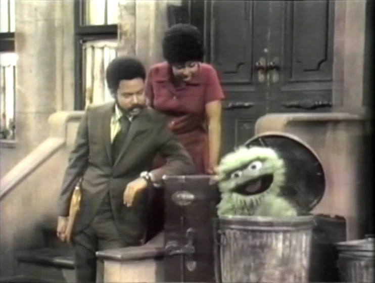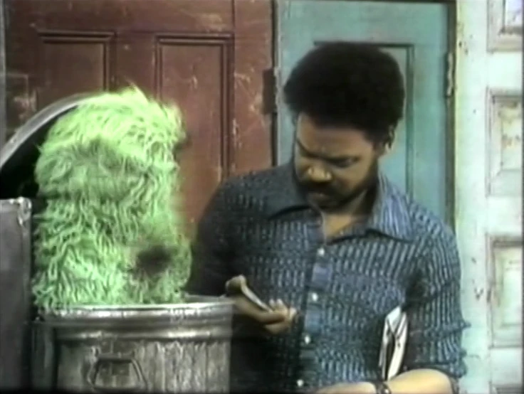 SCENE 2 | A trash can rolls past Gordon. Oscar pops out with a postal worker's hat on, claiming this is his new mobile post office. He explains how it works - for a small fee, people give him mail, he applies homemade stamps with pictures of famous Grouches in history like George Grouchington (backed with delicious strawberry-fish flavored stickum), then he cancels the process and has things sent back to their original address. He has also recruited Little Bird to handle airmail. |