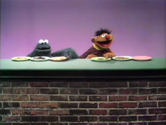 Muppets | Cookie Monster and Ernie: Ernie sings a selection song using plates of cookies. He has three plates full of cookies, and sings "Here are some things that belong together..." Then he shows a plate full of cookies and an empty plate, and sings "Which one of these things goes with the others..." He says the plate full of cookies, but what he didn't notice was that the cookies on the other plates were eaten while he was singing. Now that there will be a different answer, he sings the song again. (First: Episode 0192) |