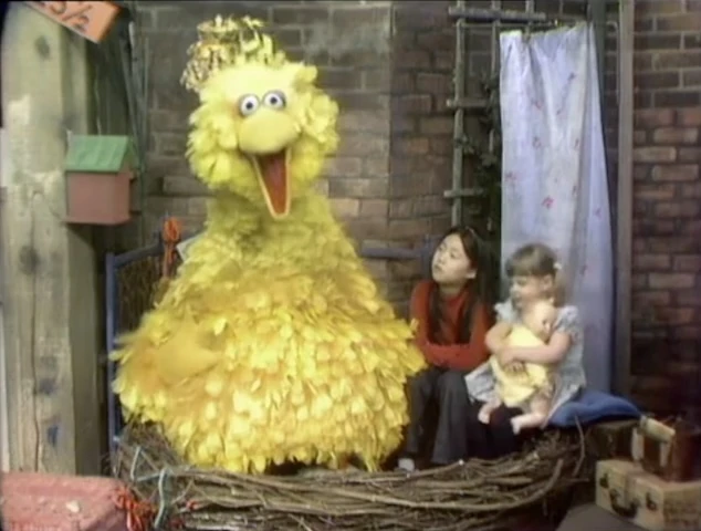 SCENE 3 | "That was a nice family," comments Big Bird. He pretends to be a daddy bird, with a girl as the mommy and Polly as a daughter. They're about to have some pretend breakfast, and Big Bird states that even lions have a family... |