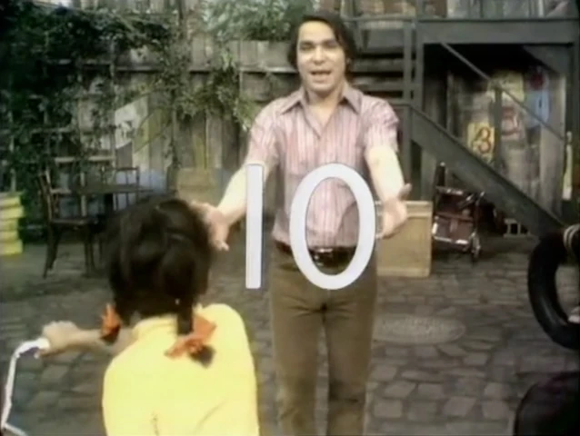 SCENE 5 | Miguel walks along Sesame Street and counts ten people (including Big Bird and Mr. Hooper) in Spanish. He introduces the following to help translate... |