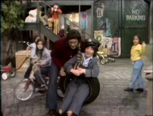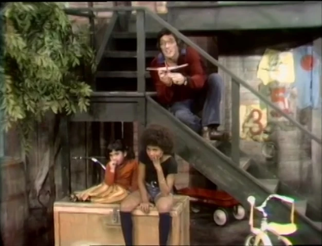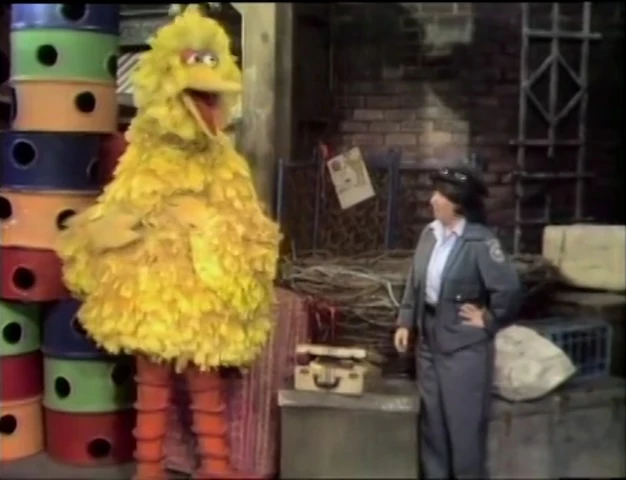 SCENE 7 | Street residents name things that can fly - Big Bird cites himself (although he admits he can't do it very well), Rafael names an airplane and Mr. Hooper mentions a helicopter. Throughout, Vanessa and another girl sigh that they can't fly, but they can pretend while flapping their arms.