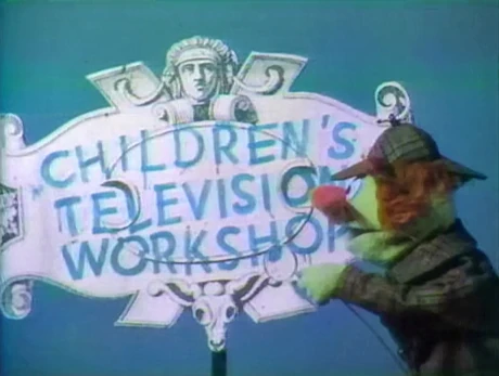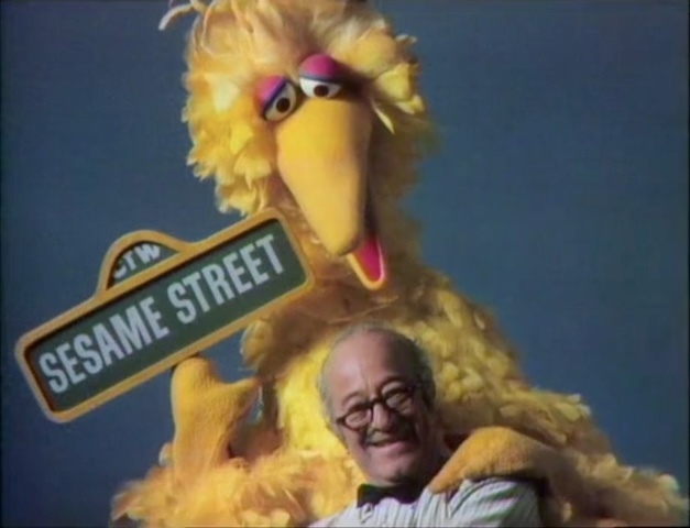 CLOSING SIGNS | Big Bird and Mr. Hooper hold the Sesame Street sign, while Sherlock Hemlock observes the CTW sign. |