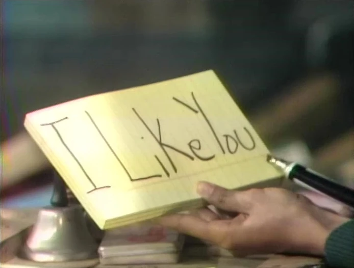 SCENE 4 | Grover delivers the bag to Maria and hangs around to deliver two words straight from his heart: "I like you." Maria points out the statement was actually three words, writing them down so he can count them. |