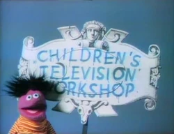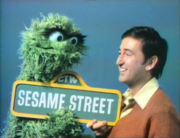 CLOSING SIGNS | Oscar and Bob hold the Sesame Street sign, while Roosevelt Franklin holds the CTW sign. |