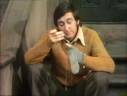 SCENE 8 | Mr. Hooper uses his trusty screwdriver again to fix a screw on the doorknob. Meanwhile, Bob uses a needle and thread to mend a hole in his sock. Back at Hooper's, Mr. Hooper's screwdriver has become broken. Since he doesn't have a second one to use, he tosses it away. |