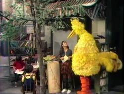 SCENE 2 | Big Bird passes by the empty storefront on the block, surprised to see some kids congregated around it. Maria explains that they've turned the space into a community library and she's serving as librarian this afternoon. Big Bird loudly cheers for the new addition to the street, unaware that libraries are meant to be quiet. He loudly starts yelling at some cars making noise nearby. |