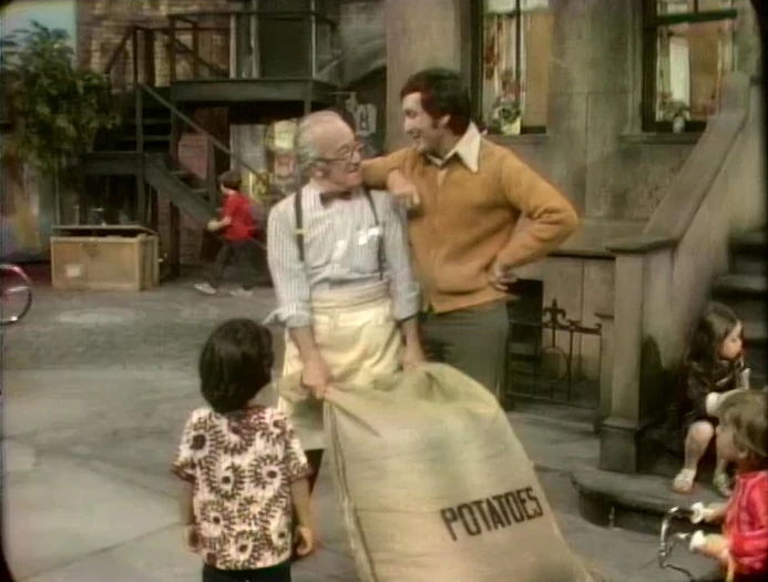 SCENE 5 | Mr. Hooper lugs a heavy bag of potatoes toward the store. Bob needs to purchase some, but if Mr. Hooper cuts open the bag, they could spill on the sidewalk. Instead, Bob helps Mr. Hooper carry the bag to the store. |