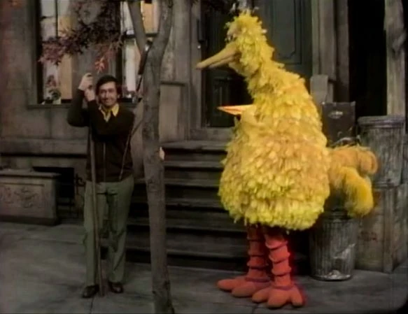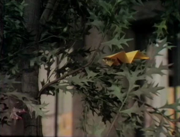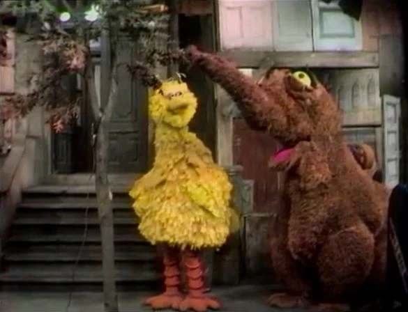SCENE 2 | Bob makes a paper airplane, and Big Bird throws it so high that it gets caught on the top branches of a tree. Big Bird isn't tall enough to reach it, and it doesn't come down when Bob shakes the tree. While Bob is gone to get a pole to knock it down, Mr. Snuffleupagus arrives and suggests that a wind can knock the plane back down. There's no wind today, so he blows the plane down with his snuffle. He shuffles down the street as Bob returns with a pole he got from the garage. Big Bird tries explaining what happened, but Bob doesn't believe a word. |