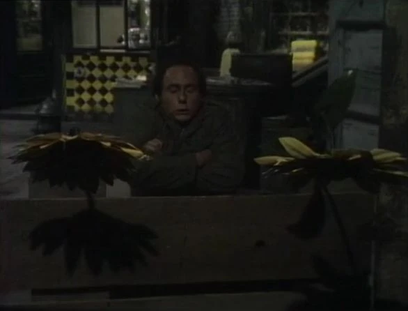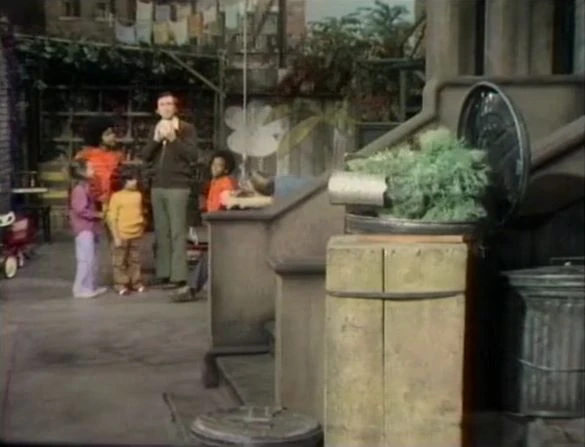 SCENE 1 | Tom enjoys the sunny weather on Sesame Street today, and Maria goes to fetch some water for a couple of sunflowers growing near the construction doors. Tom asks the viewer to imagine what it would be like if there were no sun, and we see what would happen. It would be night all the time, and everyone's indoor lights would stay on. The plants wouldn't grow and start dying, and it would be cold all the time. Tom doesn't care for this, and stops pretending so everything could go back to the way it was. |
