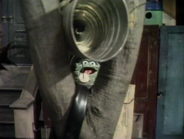 SCENE 8 | Oscar now uses his telegram cans to tell the viewer to get lost until tomorrow. Oscar peeks out from his can as Mr. Snuffleupagus announces the sponsors. |