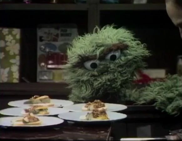 SCENE 4 | Oscar stops by Hooper's Store and orders five meals for the meeting of the Disagreeable Order of Grouches. At Oscar's request, Tom puts out five plates, then dishes out five hamburger bun rolls with five pickles, five slices of onion, five globs of spicy mustard and five scoops of chili as Oscar counts. He's about to put some hamburgers on, but Oscar stops him, saying he hates hamburgers. |