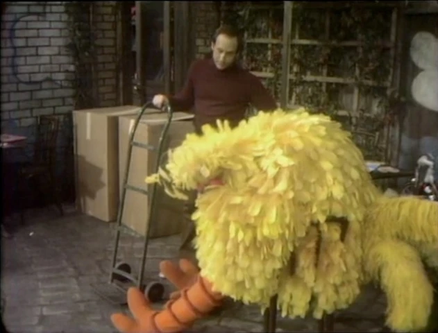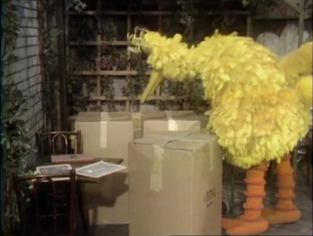 SCENE 3 | Tom asks a sleepy Big Bird to count three large boxes sitting outside before he brings them into the store. Big Bird counts the three then sits down to guard them, only to nod off again. Tom takes each box into the store via his hand-cart, subtracting each one. Whenever he goes back into the store to put them away, Big Bird awakens and counts the remaining boxes before sleeping. |