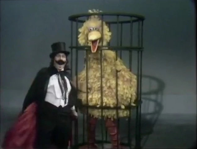 SCENE 5 | While Big Bird is asleep in the yard, David, in a spooky voice-over, observes that he's having a bad dream. The scene materializes into the dream, where a mean old villain (portrayed by Tom) makes him get into a giant cage so that he can take Big Bird to the zoo. After being woken up and comforted by Susan and Tom, Big Bird is relieved and goes back to sleep. |