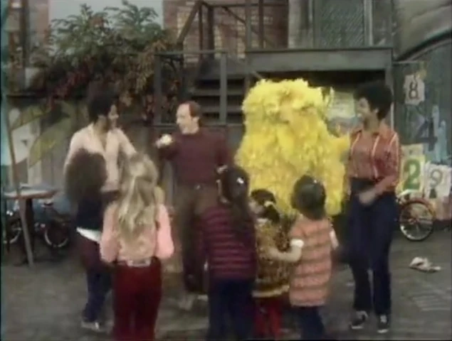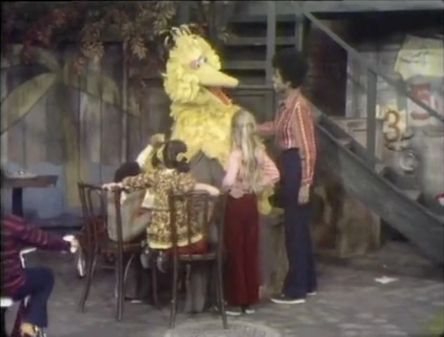 SCENE 2 | Big Bird falls asleep again while everyone else watches the skywriter make the letter D (First: Episode 0016). The crowd disperses and Big Bird offers to help Tom at Hooper's Store, but immediately dozes off, resting his head on Tom's shoulder. |