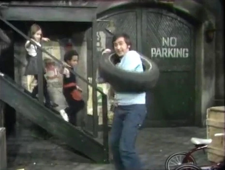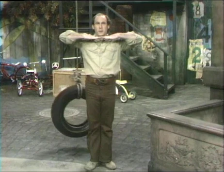 SCENE 8 | Bob and the kids play follow the leader, marching down the steps of the carriage house then getting stuck in a tire. Cookie Monster announces the sponsors. |