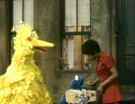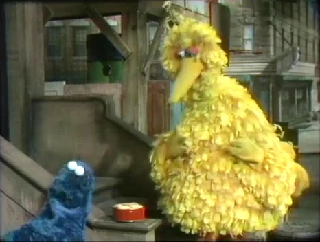 SCENE 2 | Susan has finished baking some cookies. She must leave to answer the phone, and asks Big Bird to take care of the cookies for her while she's gone. Big Bird has to go to the store, so he asks Cookie Monster to take care of the cookies. Cookie Monster is sorely tempted, but he listens to his conscience and does not eat the cookies; he keeps his promise. |