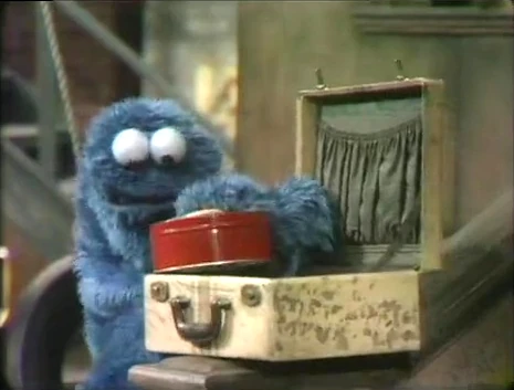 Cookie Monster is very hungry, and his conscience encourages him to avoid looking or smelling the cookies to keep his mind off them. Cookie is unable to do this for very long, though. He produces a suitcase, with a lock and chain, to keep the cookies away for good. |