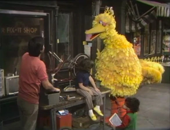 SCENE 2 | Big Bird encounters Luis at the Fix-it Shop, where Cassie is helping him fix a bike. Luis has a hammer and pliers to help him remove one of the wheels, but realizes he doesnβt have a screwdriver. He asks Big Bird to retrieve one from Mr. Hooper, and Big Bird enthusiastically sets off. |