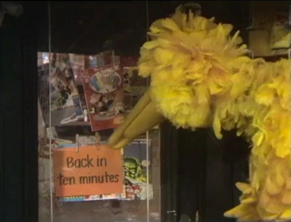 SCENE 3 | Shola joins Big Bird on his errand, but they find a sign left by Mr. Hooper saying he'll be back in ten minutes. Rather than wait, Big Bird decides to see if anyone else has a screwdriver to borrow. Bob allows him to fetch a screwdriver from his toolbox in the garage, only they find the box is locked up tight. Big Bird leaves to get the key from Bob. |