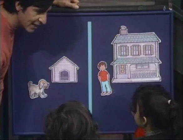SCENE 6 | Luis sings the "Same/Different Song" to the kids in English and Spanish, using drawings of a boy, a dog, and their respective houses. |