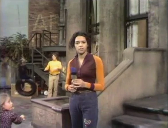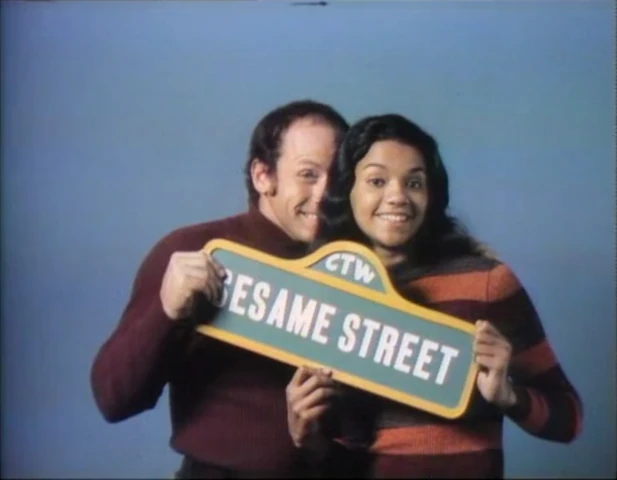 CLOSING SIGNS | Maria and Tom hold the Sesame Street sign, while Big Bird holds the Children's Television Workshop sign. |