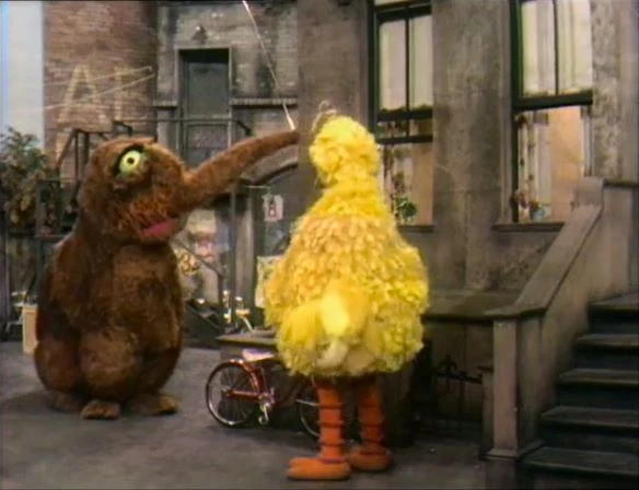 Rafael is busy looking for his glasses by the construction doors while Big Bird searches by the basement railing. Suddenly, the mysterious Mr. Snuffleupagus enters, and decides to help Big Bird look for the missing glasses. There's only one problem -- the Snuffleupagus doesn't know what glasses look like. Big Bird tries to describe them, but to Mr. Snuffleupagus, Big Bird's limited descriptions could describe either the windows or a bicycle. Finally, Snuffleupagus decides that he hasn't seen the missing glasses, and before he leaves, he asks Big Bird to take care of something he just found on the ground. It's the missing glasses! Big Bird runs to return the glasses to Rafael, explaining who found them. Rafael turns to see the Snuffleupagus, but his sight is so poor he can't make out what he's looking at. He finally puts on his glasses, but the Snuffleupagus has disappeared around the corner. Again, Big Bird fails to prove the existence of his elusive friend. |