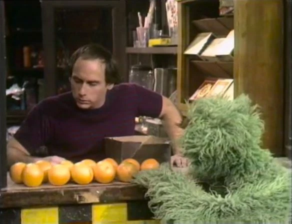 SCENE 5 | Oscar wants an old beat-up box from Hooper's Store, but it's filled with oranges. Tom says Oscar can have the box as soon as it's empty. Oscar is curious to know how many oranges the box can hold. Tom has trouble counting the oranges in the box, so Oscar suggests that he remove each orange from the box as he counts. Tom agrees with this system, placing the oranges on the counter as he counts all twelve oranges. Since the box is now empty, Oscar takes it. |