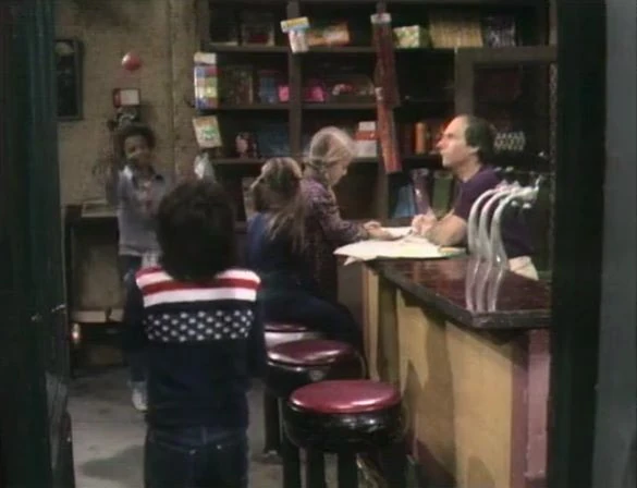 SCENE 1 | Booboo and Wendy are busy drawing with crayons outdoors. When a stiff breeze begins to blow their papers about, Tom suggests that the kids come into the store to play. Once inside, Jay and Brian arrive to get a ball to play catch with. They start to throw the ball around inside the store, but Tom suggests that it isn't the best place to play catch. The boys agree and go outside, where Tom observes that there are some things that are better to do inside, and some things are better to do outside. |