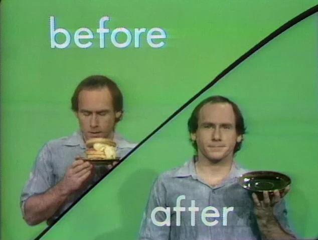 Cast | Before and after in splitscreen: Tom with a sandwich, Luis giving Bob a haircut, and Susan with a potted plant. (First: Episode 0316) |