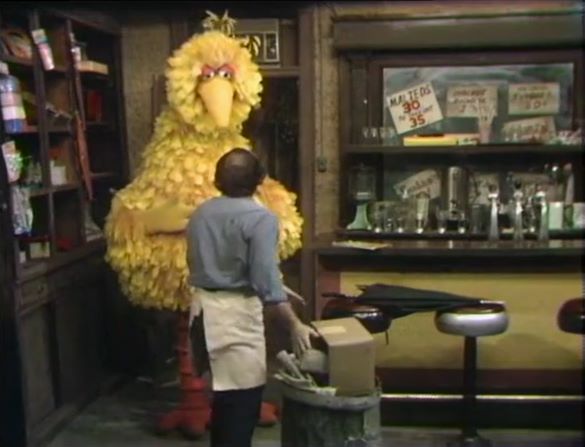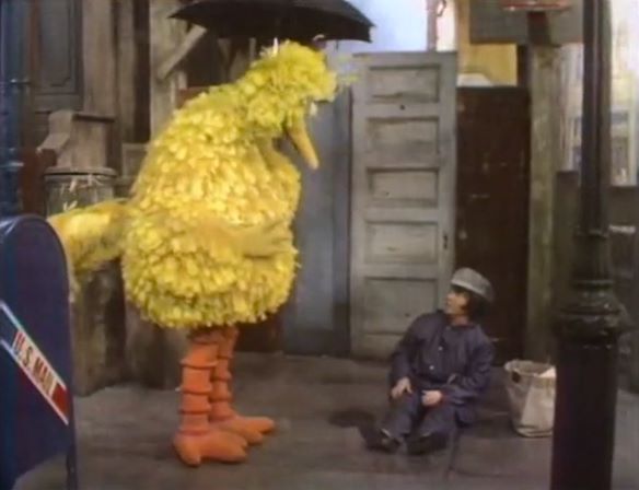 SCENE 8 | Big Bird wants to help Tom by opening the door when he takes the garbage out. Big Bird has a bit of trouble with the task, as he leaves the door open when Tom isn't ready. Tom makes it clear to close the door once he's outside, and Big Bird finally gets the picture. When Tom goes out with the garbage, Big Bird refuses to let him back in. Tom enters soaking wet through the front door, glaring at a clueless Big Bird. |
