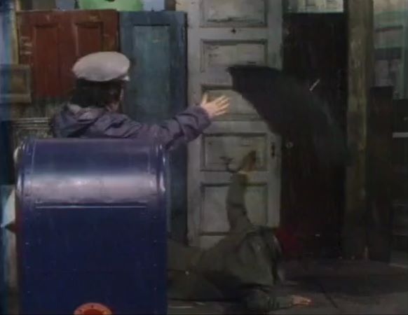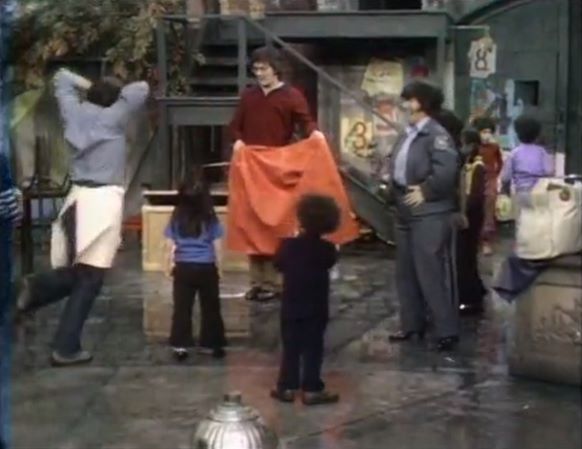 SCENE 9 | The rainstorm ends, and the sun comes out. Everybody plays outside in the sunshine as Tom and Rafael have a pretend bullfight with one of the raincoats. Big Bird announces the sponsors of "slightly soggy Sesame Street": B, M, and the "slightly wet" number 4. The credits follow. |
