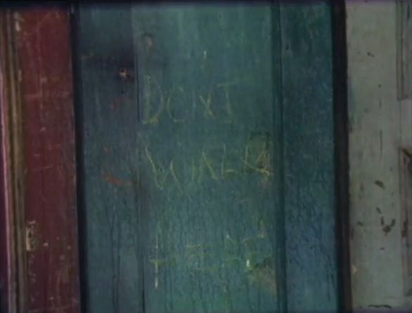 SCENE 4 | Molly slips on a slippery spot on the ground, and Big Bird helps her up. They worry about other people slipping on that spot, so Molly uses a piece of chalk to write a message -- "Don't Walk Here" -- with an arrow that points to the slippery spot. |