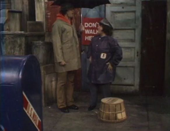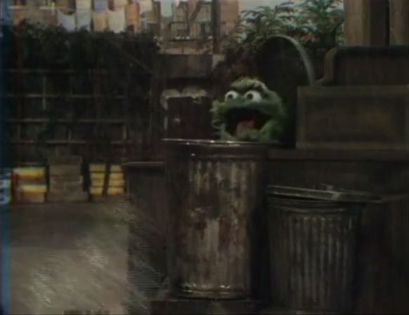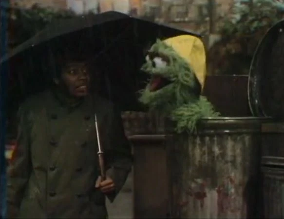 SCENE 7 | Oscar is enjoying the rainy day β nobody's playing outside, and everybody's getting wet and muddy. His fun is ruined when he gets splashed by a passing car, causing him to scream at the offscreen driver. David walks by in the middle of Oscar's outburst, and assures Oscar that the driver didn't do it on purpose, but Oscar insists otherwise. David then shows Oscar how he would handle the situation himself using a calmer approach, until the same thing happens to him when another car passes by, with the same result. Oscar, impressed by David's anger, tells David that he has the makings of a first-rate grouch. David gives him a sarcastic laugh as Oscar remarks, "Not a bad day after all!" |