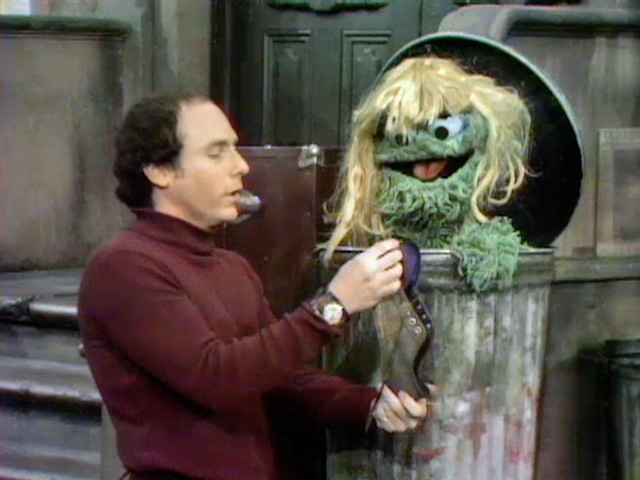 SCENE 3 | Oscar is tired of seeing the viewer and all the other happy people on Sesame Street, so he disguises himself as a little girl named Melody. Tom encounters “Melody,” who says that Oscar doesn't live there anymore. Tom catches on to Oscar's scheme and plays along, walking away with the ratty sneaker he was going to give to Oscar. Oscar can't resist and becomes himself again and calls Tom over. Tom flip-flops on whether to give the sneaker to Oscar or Melody, causing Oscar to duck in and out of costume over and over until he finally relents and claims the shoe for himself. |