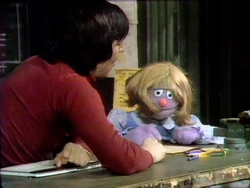 SCENE 7 | Luis encounters an Anything Muppet girl named Emily (Fran Brill), who looks sad. She wants to get a birthday card for her Spanish-speaking friend Esteban, but couldn't find any Spanish cards at Hooper's Store. Luis cooperates by having Emily draw a picture on the card, and he writes down Emily's message in Spanish. |