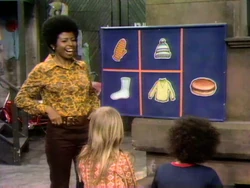 SCENE 9 | Susan sings "Three of These Things" with pictures of a mitten, a sweater, a sock, and a teddy bear. She removes the teddy bear to play "Here Are Some Things" with the options being a woolen hat and a hamburger. |